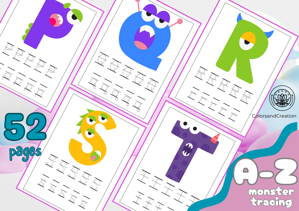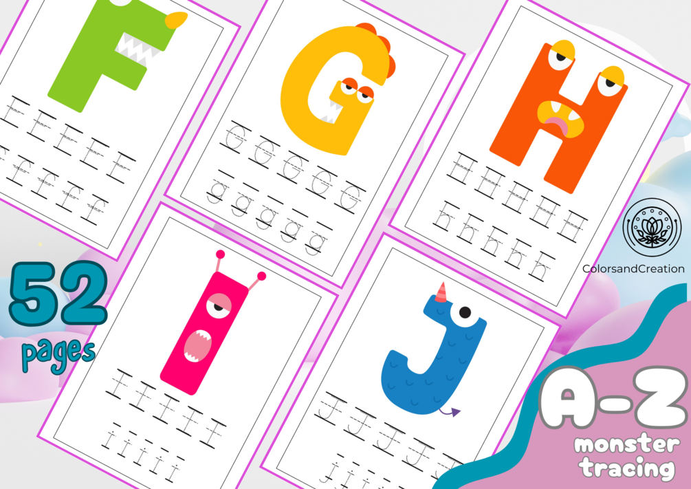 You'll get a soft copy of 52 pages of A-Z monster alphabet tracing